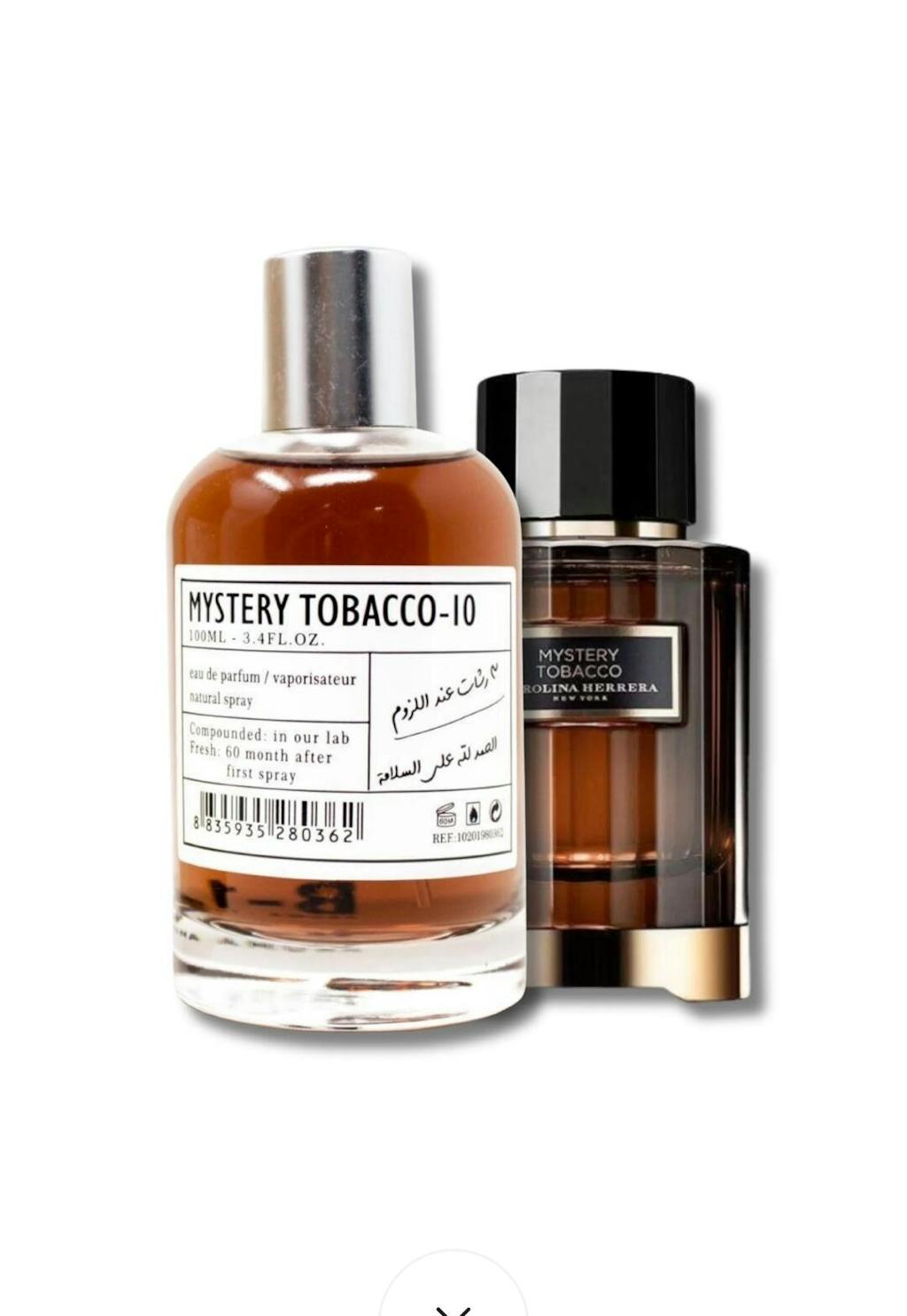 Made in France by B-12. Mystery Tobacco-10 is a Fragrance based on Mystery Tobacco, the Eau de Parfum Fragrance by Carolina Herrera For Men and Women. Like the original, Mystery Tobacco-10 has top notes of Ginger, Osmanthus, Citruses, Artemisia; and heart notes of Tobacco, Patchouli, Guaiac Wood, Vetiver; and base notes of Tonka Bean.