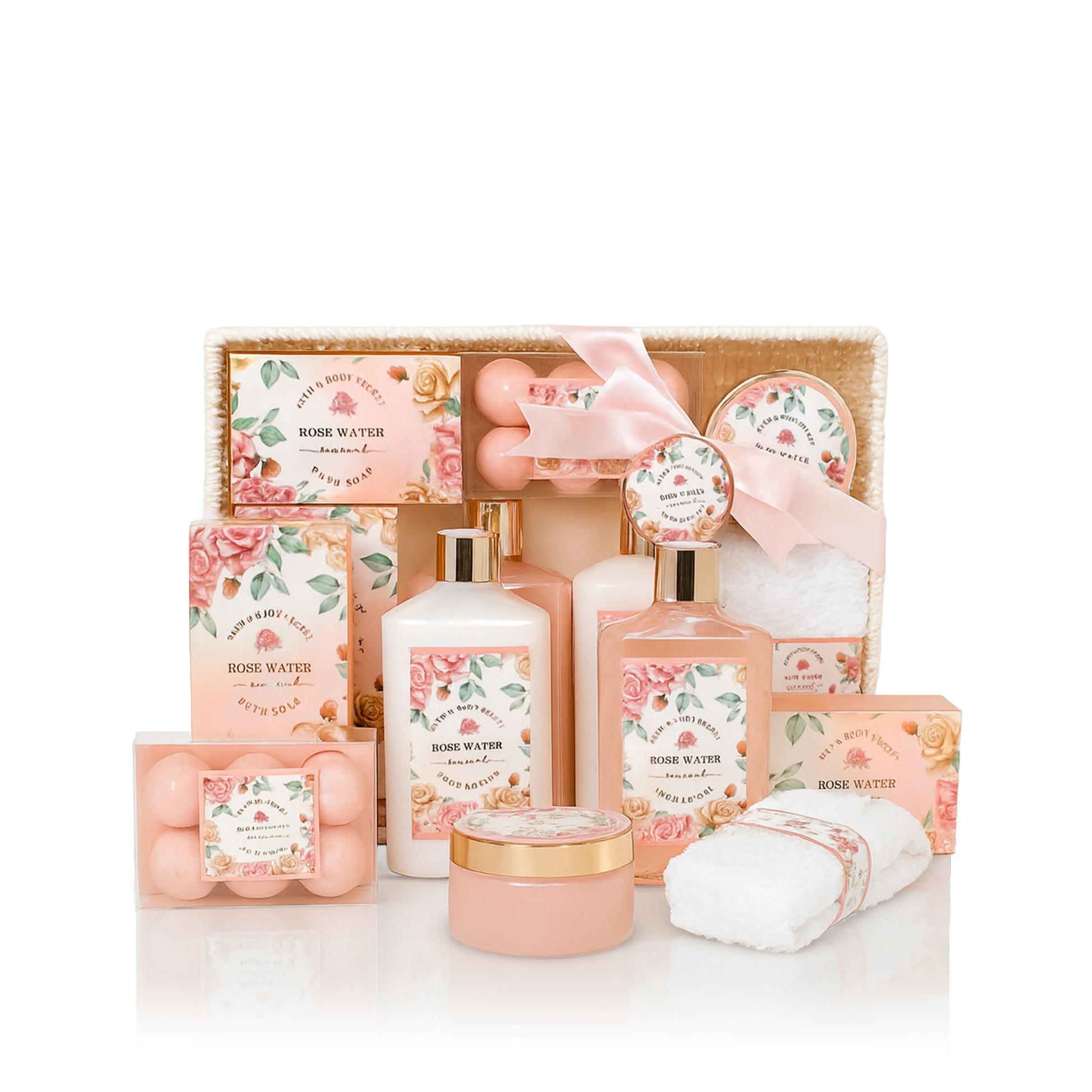 Shower Gel 270 ml Body Lotion 270 ml Body Scrub 120 ml Bathtub salts 200 Soap 100g Bath Fizzers 15g x6pcs Bath towel Basket