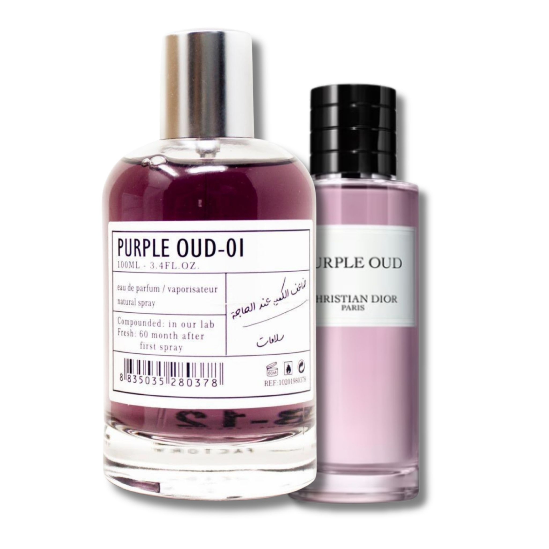 صُنع في فرنسا بواسطة B-12. عطر Purple Oud-01 هو عطر مُستوحى من عطر Purple Oud، وهو عطر أو دو بارفان من كريستيان ديور للرجال والنساء. وكما هو الحال مع العطر الأصلي، يحتوي Purple Oud-01 على نفحات من العود، والزعفران، والفلفل الوردي، والبرتقال. تُصنّع B-12 عطورًا مُصممة خصيصًا بناءً على نفس تركيبة العطر الأصلي.